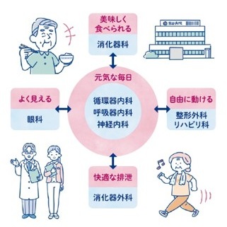 私たちが健康で元気な毎日を過ごしていくためには、心臓がちゃんと動き、呼吸ができ、そして体の精神・神経系が働いていることが大切です。そのうえで、毎日の食事をおいしくいただけることと快適な排泄が 行われることが必要です。さらに私たち人類は外界の変化を見ることでよく知り、その結果に基づき自由に動けることが大切です。 図にお示ししますようにこれらの体の機能をちゃんと働かせるように、 柴田病院では、循環器内科、呼吸器内科、神経内科の先生方が元気な毎日を、 消化器内科と消化器外科では口から肛門までのいわゆる消化器を診察させていただきます。それに加え、眼科では高齢者のための白内障手術を行っています。また柴田病院ではリハビリテーション科に加え、新たに整形外科の先生による診察も行っています。 まだまだ常勤医師は四名と少ないですが、山口大学病院の先 生方のご支援のおかげ で、医療体制は整いつ つあります。