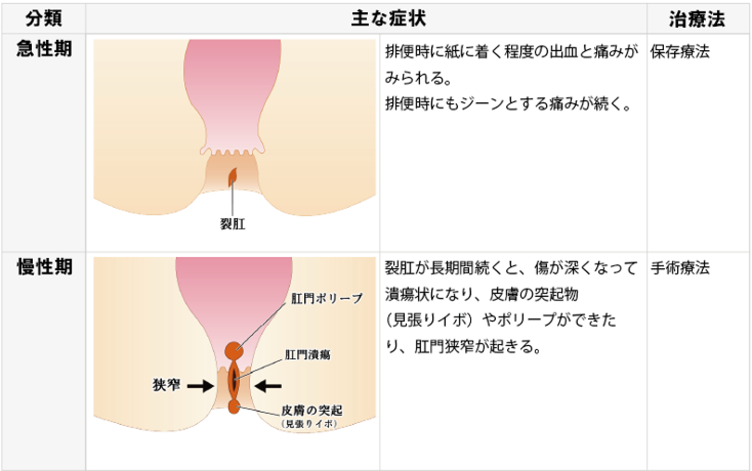 | 慢性期 | 裂肛が長期間続くと、傷が深くなって腫瘍状になり、皮膚の突起物(見張りイボ)やポリープができたり、校門狭窄が起きる。 | 手術療法 |