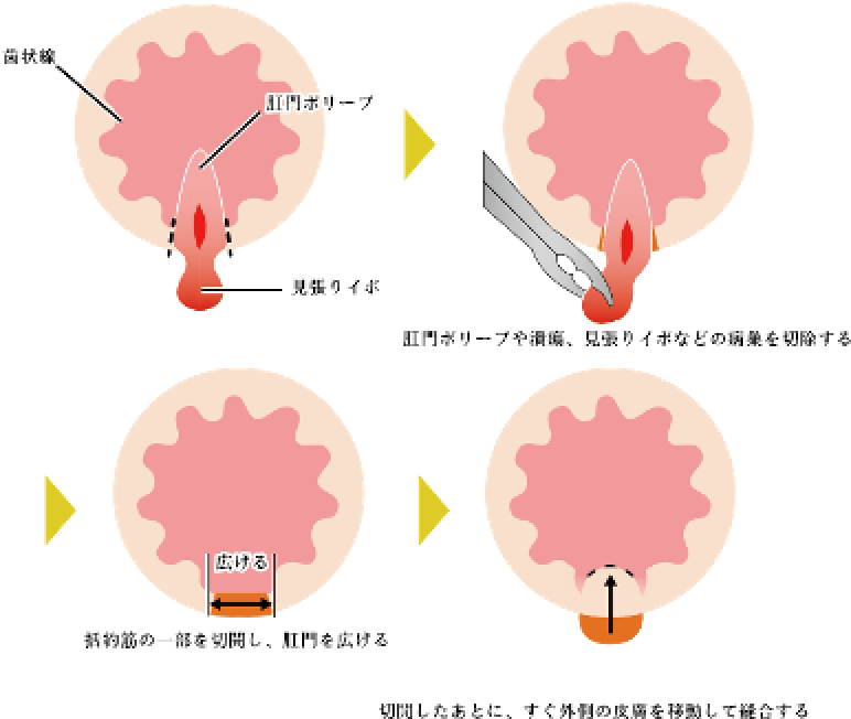 - 肛門ポリープや腫瘍、見張りイボなどの病巣を切除する