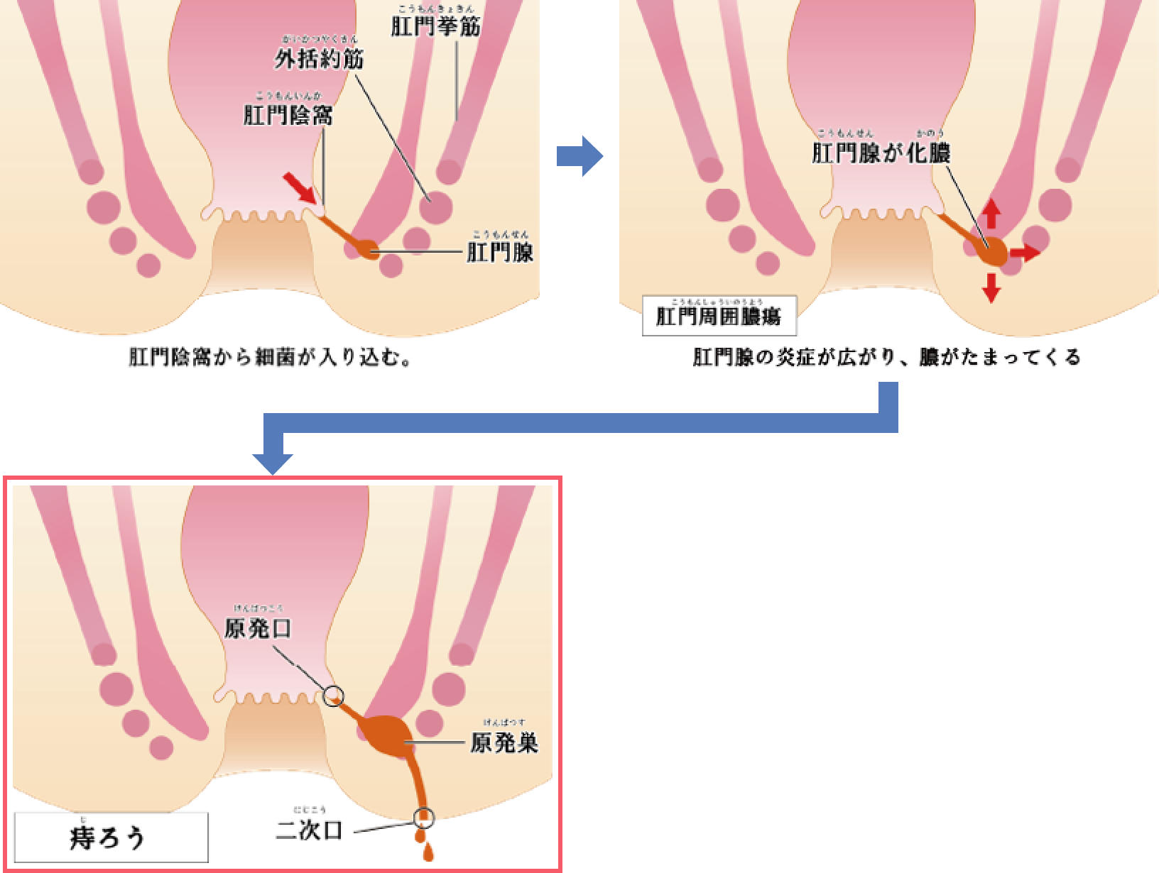 肛門の奥にある「肛門腺」と呼ばれる部分に細菌が感染し、炎症とともに膿がたまり、その膿が皮膚へと破れて出ることでトンネルが残り、それが痔ろうとなります。